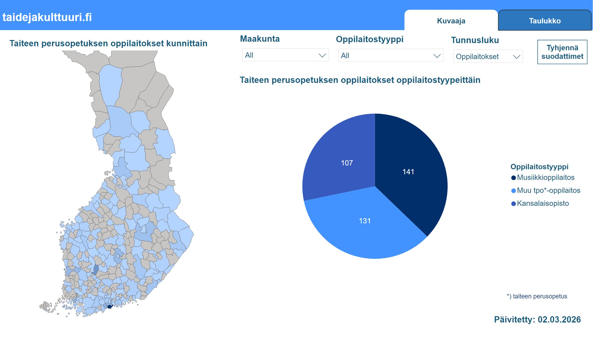Avaa raportti (avautuu uuteen välilehteen)Tieto peräisin Tilastokeskuksen oppilaitosrekisteristä. Rekisteriä on päivitetty vuonna 2023 kattamaan kaikki taiteen perusopetusta antavat oppilaitokset (kunnan päätös taiteen perusopetuksen järjestämisestä tai opetus- ja kulttuuriministeriön järjestämislupa). [TK_08a]